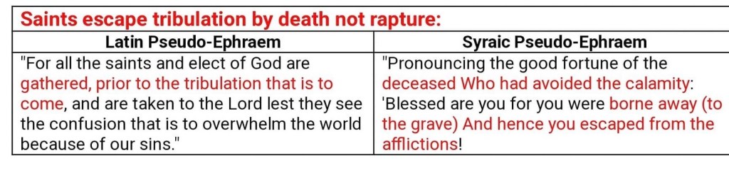 To look even further into the possible foundation of a supposed pre-tribulation rapture, there’s a text from a “pseudo” Ephraim (also spelled Ephrem) which attempted to be attributed to the Syrian early Church theologian. However, there’s controversy not only surrounding its dubious authorship and date, but also how it was translated. While one translation of it might imply a pretrib rapture, the original Syrian version clearly shows that it’s only death that causes some to avoid tribulation. Furthermore, there are other passages in both versions that might also imply that Christians don’t escape tribulation. Notice the huge (and possibly intentionally misleading) difference when it was translated from the original Syrian into Latin and then into English: