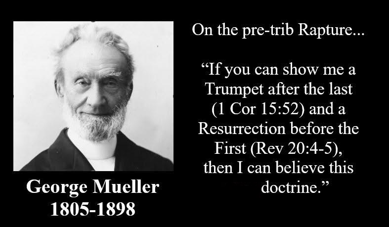 Because of its novelty, when John Nelson Darby presented it to his Church, the Plymouth Brethren, it was rejected by its leaders such as Benjamin Newton and the renowned George Mueller, who supposedly replied, “If you can show me a trumpet after the last [1 Corinthians 15:52] and a resurrection before the first [Revelation 20:4-5], then I can believe this [new] doctrine.” Mueller has also been quoted as saying, “My brother, I am a constant reader of my Bible, and I soon found that what I was taught to believe did not always agree with what my Bible said. I came to see that I must either part company with John Darby, or my precious Bible, and I chose to cling to my Bible and part from Mr. Darby,” (Scriptural Truth About the Lord’s Return, Robert Cameron, p. 146-147).