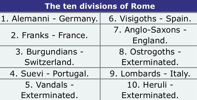 The Roman Empire ended up dividing into the Western and Eastern halves of the Roman Empire, which could possibly be depicted as the two legs of the statue. Yet remember that the previous kingdom of Greece had been depicted as the “thighs,” even though it wasn’t literally two separate kingdoms. While it could’ve been possible for each foot to have had 5 toes, it turned out that all of 10 kingdoms from the prophecy were actually to be found within the Western half. Technically, the fall of the Roman Empire in 476 AD can be referred to as the fall of the “Western” Roman Empire, or simply “the fall of Rome.” It was the loss of central political control within the Western Roman Empire when the ability to enforce its rule ended and its vast territory divided.