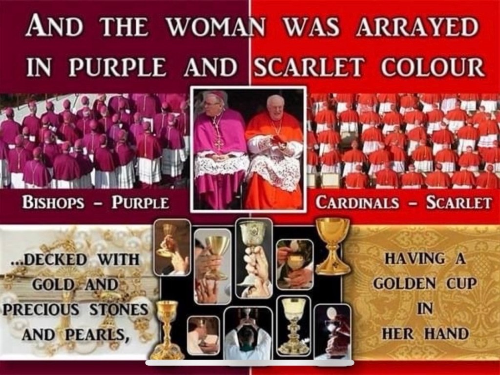 Furthermore, the woman in Revelation 17, who symbolizes the apostate Church, is clothed in purple and scarlet, riding upon the beast. These vivid descriptions match the attire of the Catholic Church with remarkable precision. According to the Catholic Encyclopedia, the Cappa Magna is a long purple wool cloak worn by bishops, while cardinals wear scarlet robes. Similarly, the Cassock—an ankle-length robe worn by Catholic clergy—is purple for bishops and other prelates, and scarlet for cardinals. These colors, long used by the Catholic Church, perfectly correspond with the imagery found in Revelation 17, reinforcing the direct connection between the apostate Church and Rome.